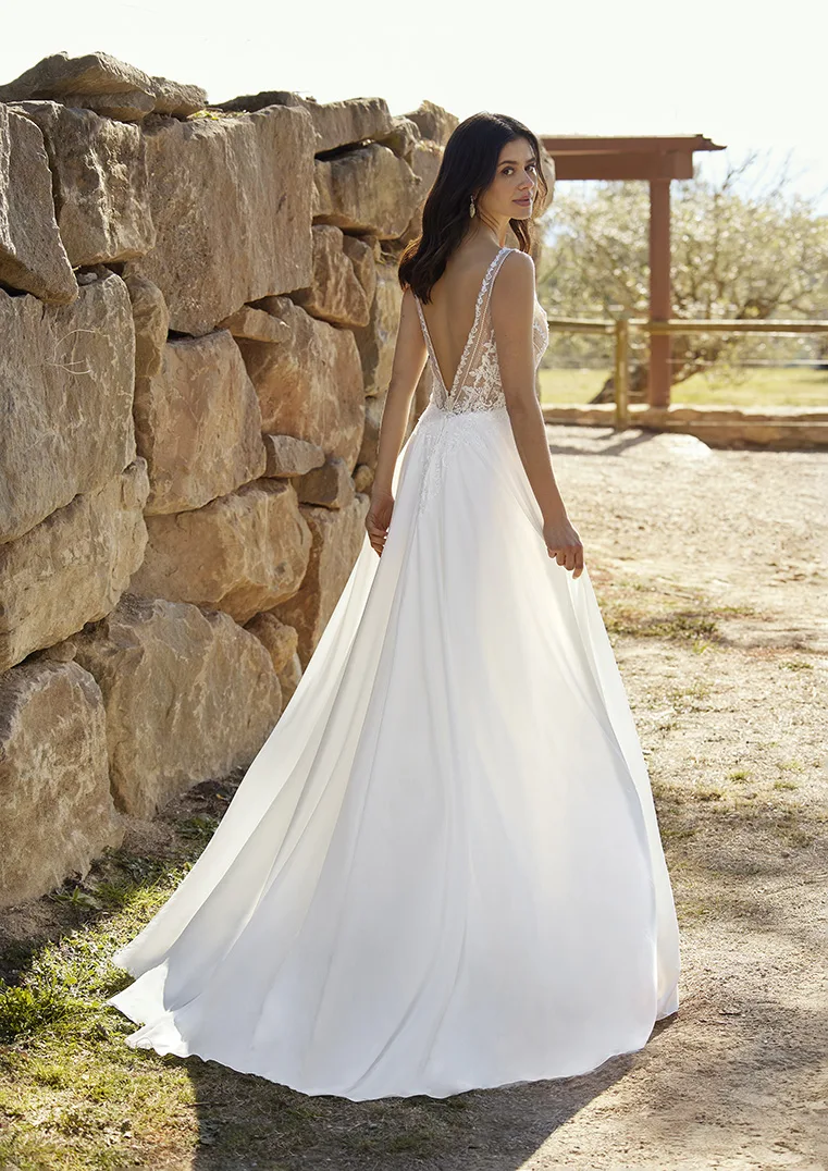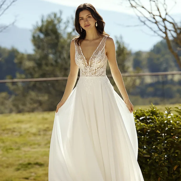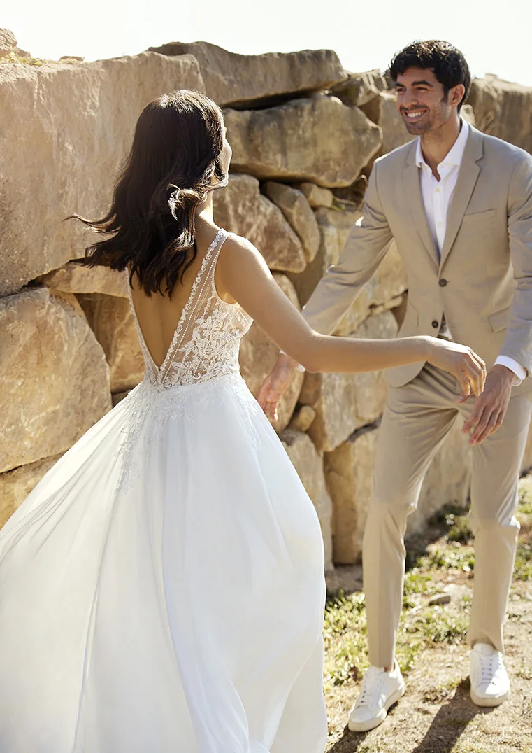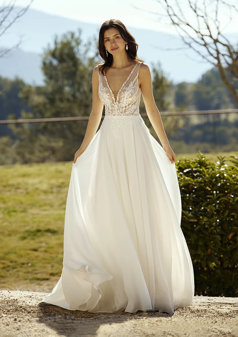 Das Brautkleid Gladness von White One ist am Oberteil mit einem Mix aus grafischer und floraler Spitze bedeckt. Durch die Musterkombination sowie den zusätzlichen Einsatz von Perlen und Pailletten entsteht ein dezent-moderner Boho-Look. Die Spitze bedeckt noch den Ansatz des gefütterten Chiffonrocks, ehe dieser leicht ausgestellt und in einer abgerundeten Schleppe zu Boden fließt.
