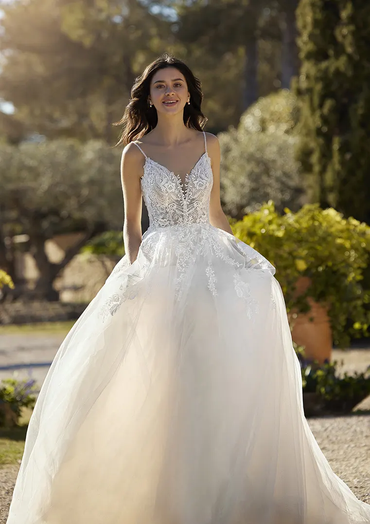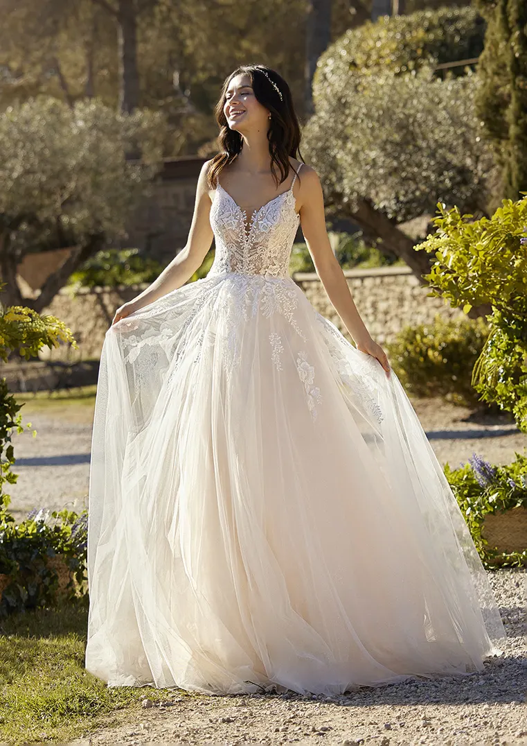 Das Brautkleid Glory von White One zeigt sich modern und romantisch, mit einem Hauch Boho-Chic. Der aus zart champagnerfarbenem Glitzertüll gefertigte Entwurf ist vom Oberteil bis in die obere Rockpartie mit floraler Spitze bestickt. Perlen zieren die Spaghettiträger, während zusätzlich abnehmbare, seitliche Träger dem Ausschnitt einen Carmen-Stil verleihen. Der große Rückenausschnitt ist mit einem geknöpftem Keyhole-Detail versehen. Darunter fächert sich der Glitzertüllrock voluminös auf und endet in einer ovalen Schleppe.
