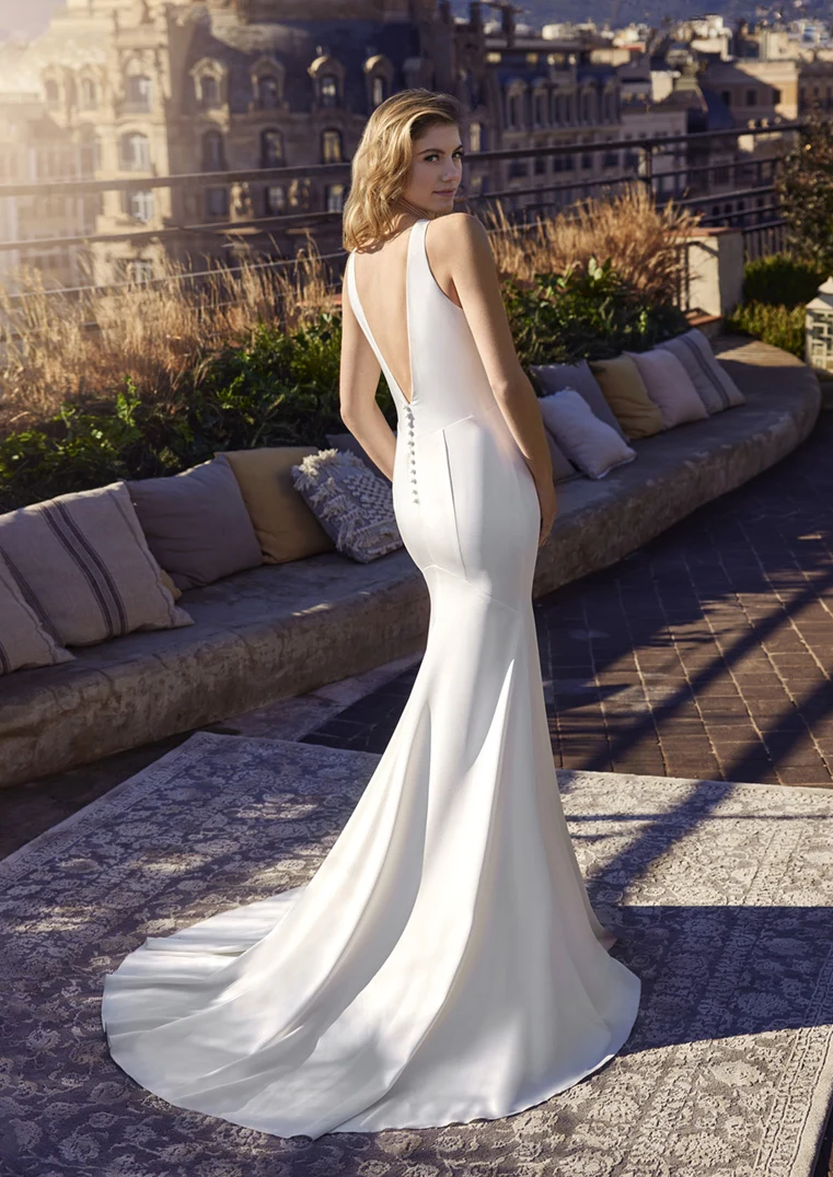 Lucid von White One erfüllt Deinen Traum vom figurbetonten, minimalistischen Brautkleid. Das gesamte Modell ist auch Crêpe gefertigt. Der tief V-förmig ausgeschnittene Rücken steht im Kontrast zur hochgeschlossenen Front. Eine Knopfleiste verläuft unterhalb des Rückenausschnitts. Der Rock ist ab Oberschenkelhöhe leicht ausgestellt und ergießt sich in eine glatte Schleppe.
