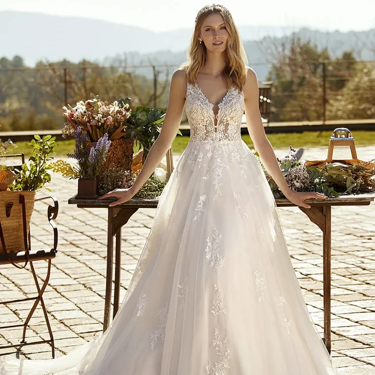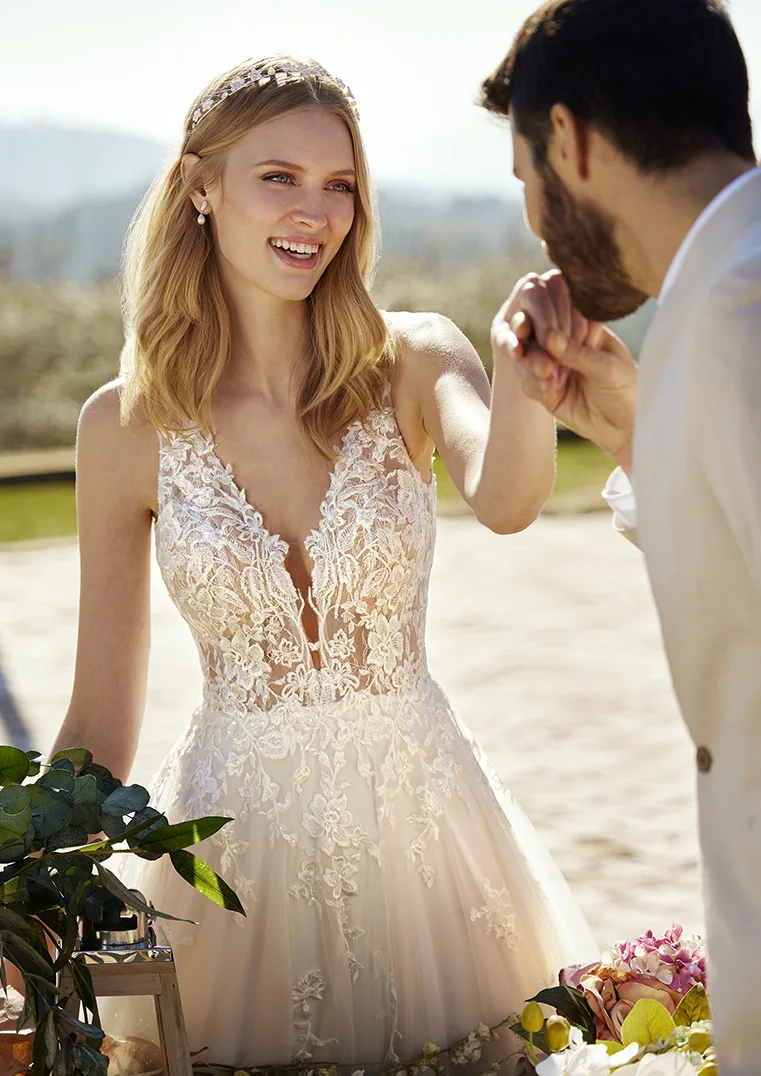 Thrills von White One ist ein klassisches Brautkleid mit detailreichen Spitzenstickereien. Am transparenten Oberteil sind zarte Chantilly- und florale Spitze übereinander geschichtet und rahmen das tiefe Dekolleté. Darüber verteilen sich Pailletten. Ab der Taille weitet sich der gefütterte, lichtdurchlässige Tüllrock. Die florale Spitze setzt hier sich bis in die breite Schleppe fort.