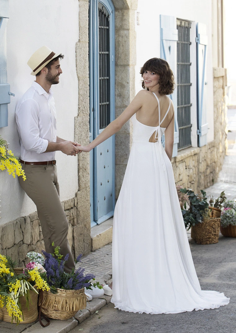 Das Brautkleid Vivacity von White One verleiht Dir einen entspannten und modernen Boho-Look. Das Oberteil mit Wickeloptik an der Vorderseite ist am Rücken mit einem Keyhole-Ausschnitt versehen. Dort befindet sich außedem eine Schnürung, die aus den zusammenlaufenden Trägern gebunden wird. Der Chiffonrock ist vorne geschlitzt und bildet an der Rückseite eine kleine, leicht zu handhabende Schleppe – perfekt für das standesamtliche Jawort.
