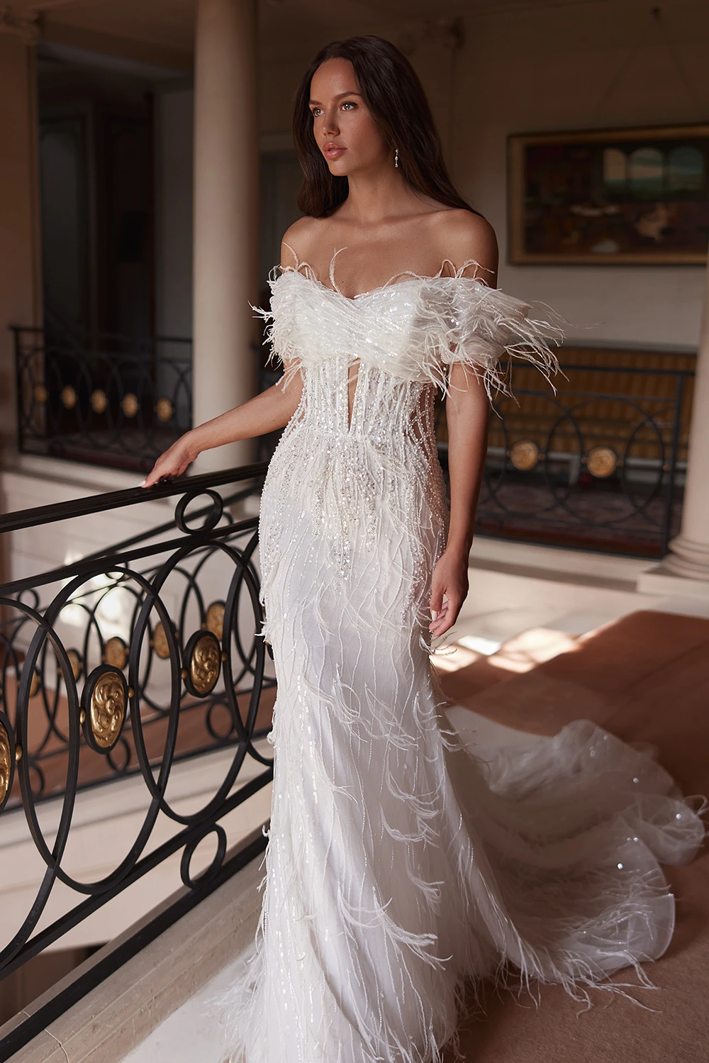 Das Modell Demi von Yedyna ist ein extravagantes Fit und Flare Brautkleid mit Carmenträgern, sexy Cut-Outs und Federn im Verlauf des Rockes und der Schleppe.