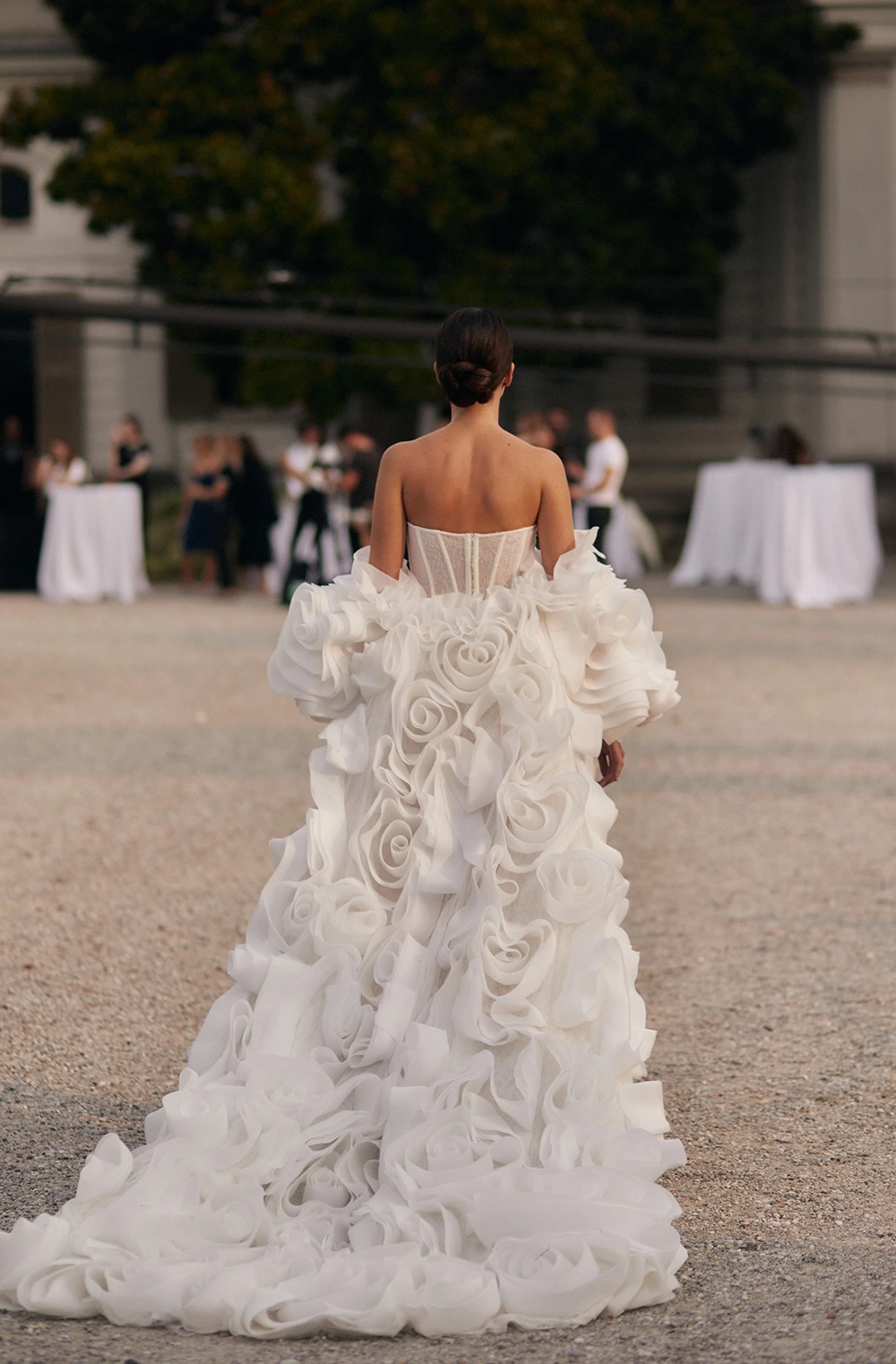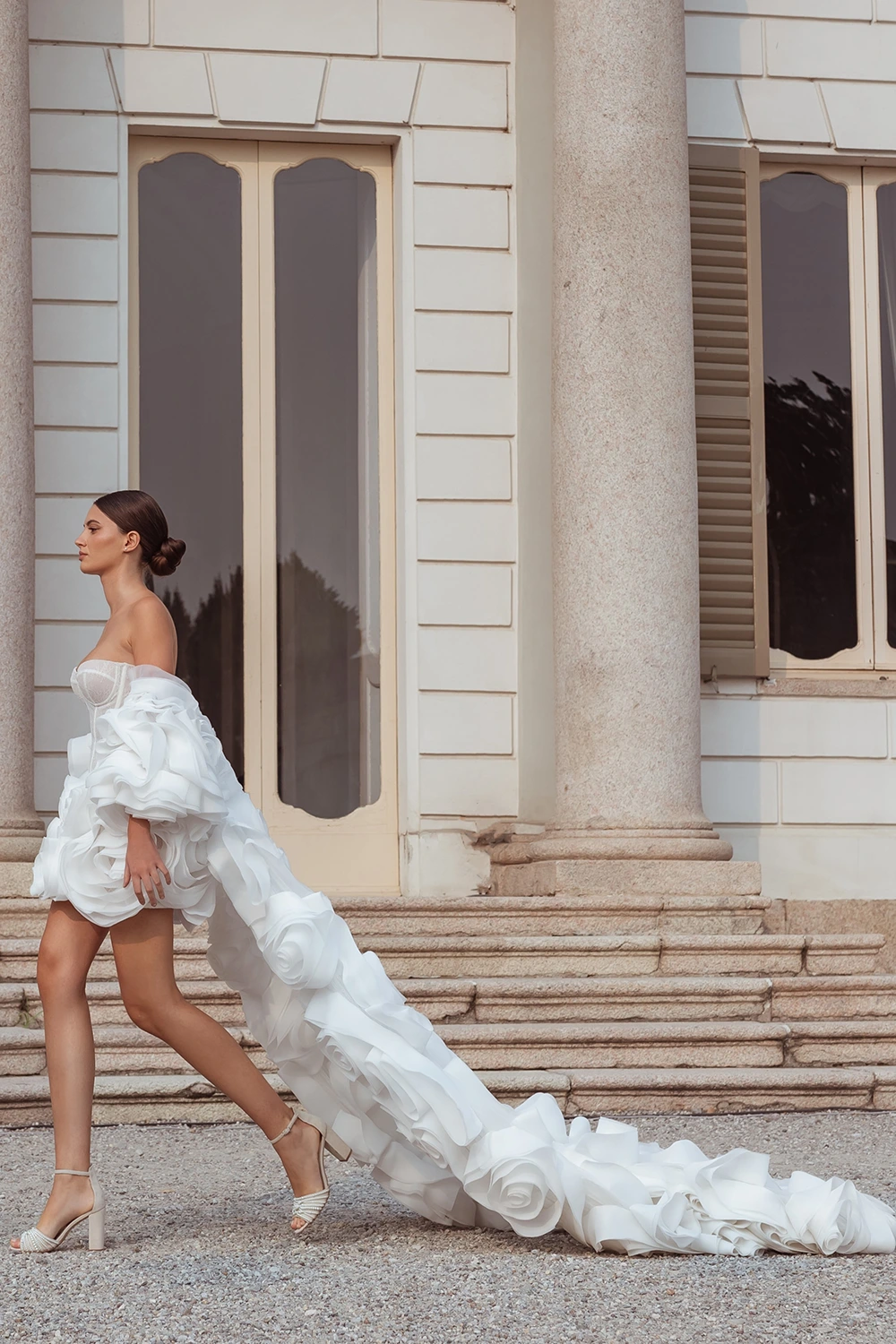 Das Modell Denisa von Yedyna ist die Wahl für einen besonderen Anlass, bei dem die Braut darauf abzielt, zu glänzen und die Aufmerksamkeit aller zu erregen. Die trägerlose Corsage, das mit einem Hauch von Minimalismus entworfen wurde, hebt die atemberaubenden Verzierungen auf dem Rock hervor.